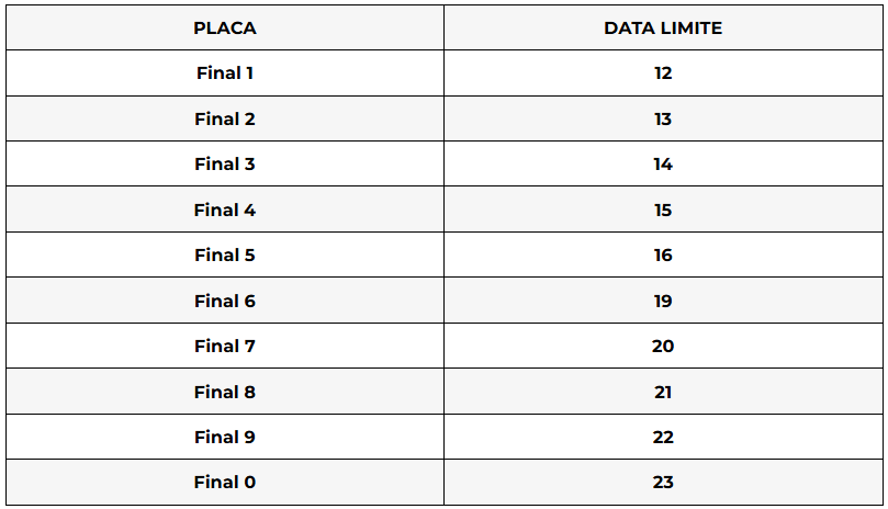 Confira as datas limites para cada placa para pagamento à vista, em janeiro: