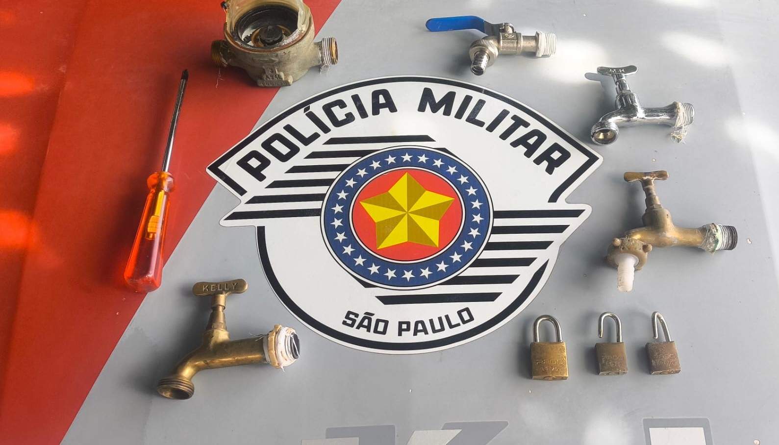 Ele carregava, segundo a Polícia Militar, uma sacola plástica que continha um registro hidráulico, uma chave de fenda, 4 torneiras com marcas de uso e 3 cadeados, sendo dois deles estourados.